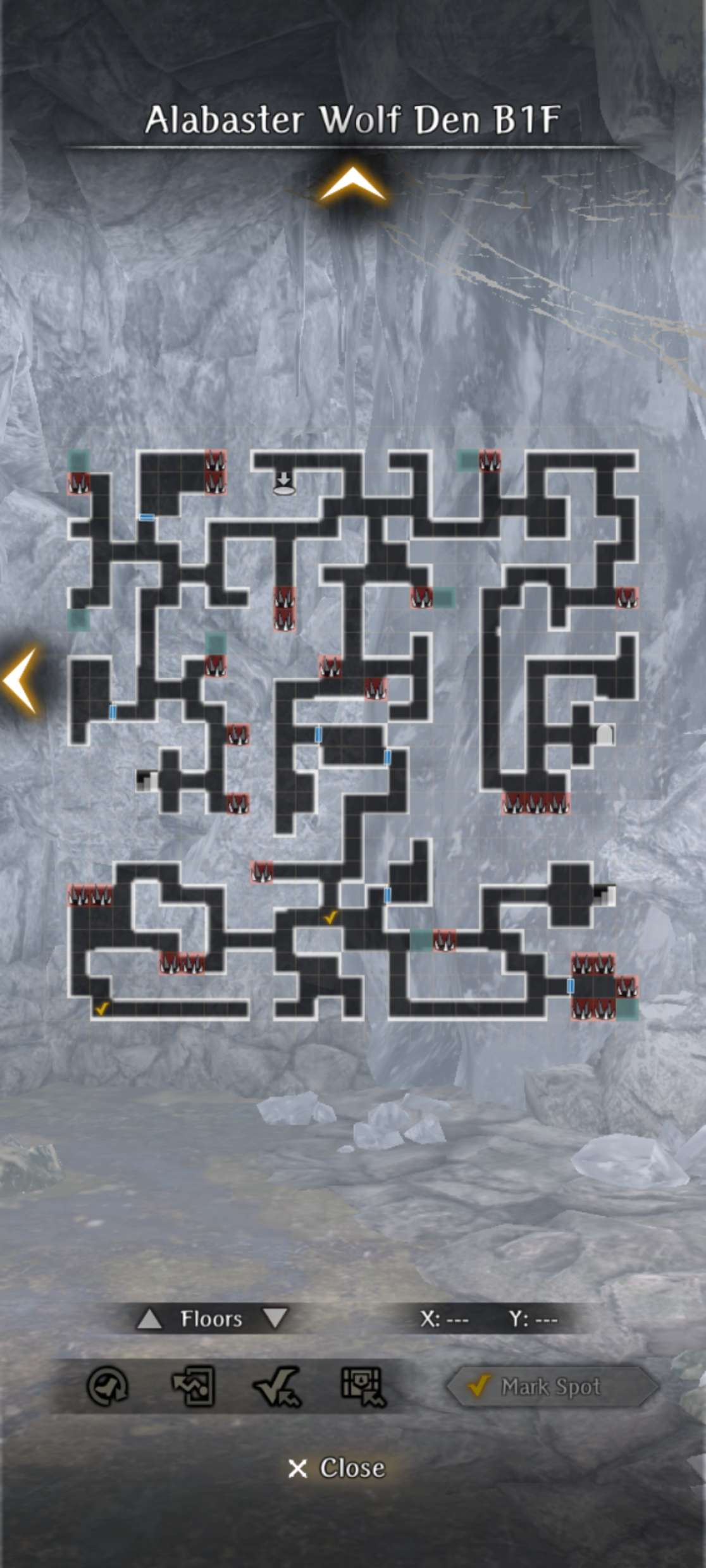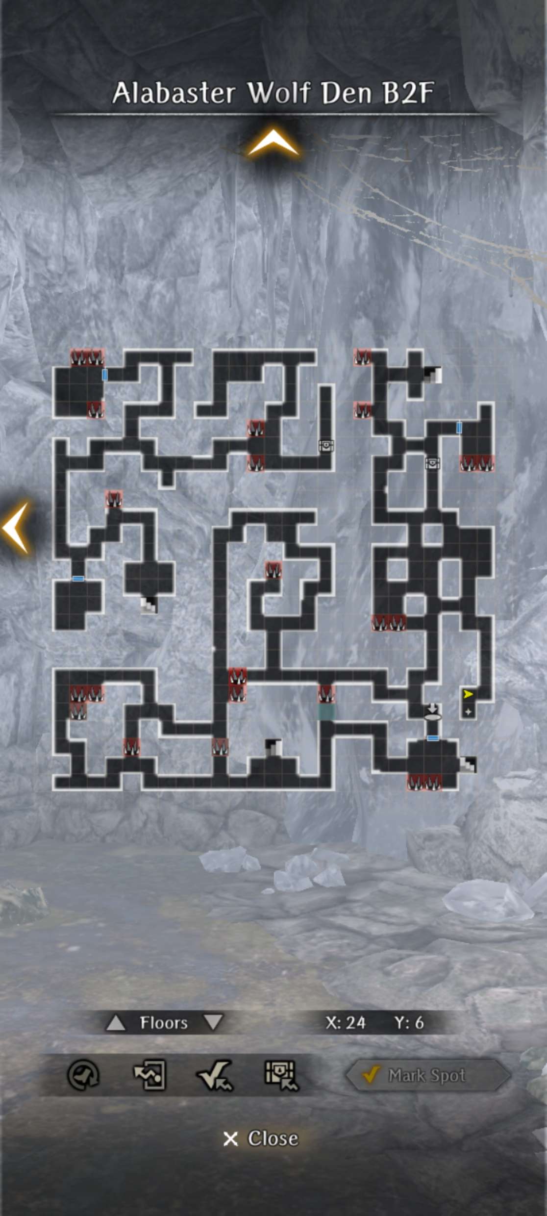 - The dungeon has 3 floors with branching paths and spike traps scattered throughout. On both B1F and B2F there are 2 drop-down holes that lead to optional side areas.